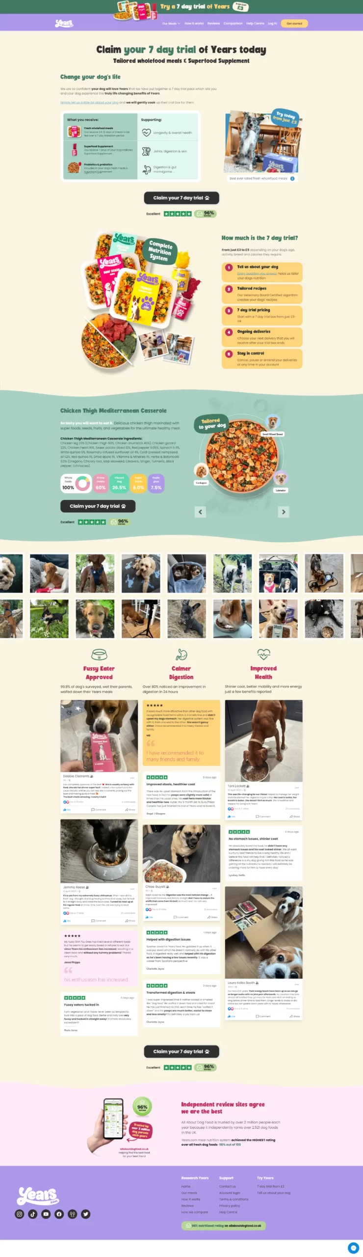 Lots of reminders to the customer of company trust with Trustpilot and allaboutdogfood.co.uk links.